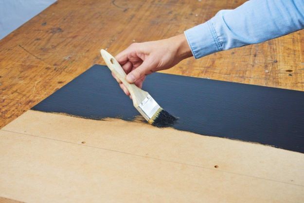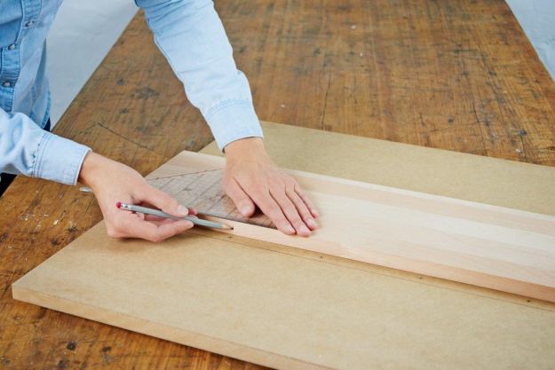 MDF и фанеру обрезать до нужного размера, сразу же в магазине. На доске нарисуйте линию в месте, где будет располагаться полка. Не забудьте оставить достаточно места над ней, чтобы обеспечить пространство для сохранения недельного списка покупок. На нарисованной линии отметьте три места для просверливания отверстий – два на расстоянии 5 см от концов пластины, один в ее центре. В середине расстояния между назначенными точками вычислить еще два места, в которых будут расположены деревянные штырьки. Затем перенесите эти точки на ламинированный фанеру. Примечание: делайте это аккуратно, чтобы штырьки подходят идеально.