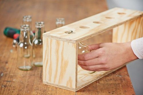 Сначала измерьте точно длину и ширину бутылки и диаметр их горловин. Затем, с помощью блока пилы универсальной, вырезать из доски или фанеры, 4 элемента, соответствующих различным размерам – так, чтобы иметь возможность создать из них основание, крыша и боковые стенки стойки.